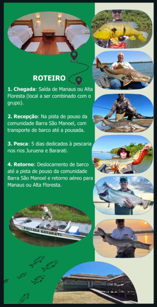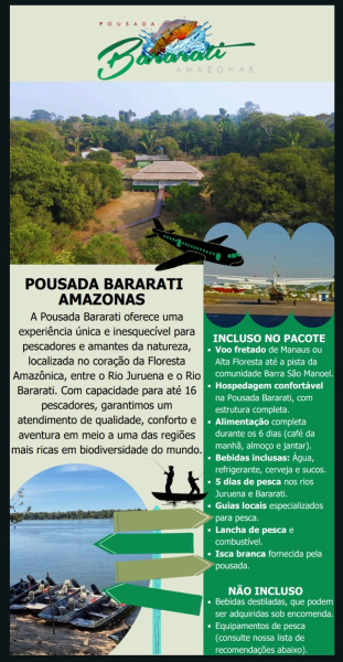 CONTAMOS COM UMA PISTA DE AVIÃO E PARA CHEGAR ATÉ A POUSADA CERCA DE 40 MINUTOS DE LANCHA EXISTE UMA VASTA VARIEDADE DE PEIXES DE TODOS OS TAMANHOS E QUALIDADE (COURO E ESCAMA), PESCA DE Flyer PESCA DE ARREMESSO PESCA DE FUNDO POUSADA EXCLUSIVAMENTE PARA QUEM GOSTA DE PESCAR INSTALAÇÃO NOVA , ALOJAMENTOS NOVOS, E UMA ESTRUTURA ESPETACULAR PARA VOCÊ AMIGOS E FAMILIARES, SE AVENTURAR PELA SELVA AMAZÔNICA COM SEGURANÇA CONFORTO E PROFISSIONALISMO